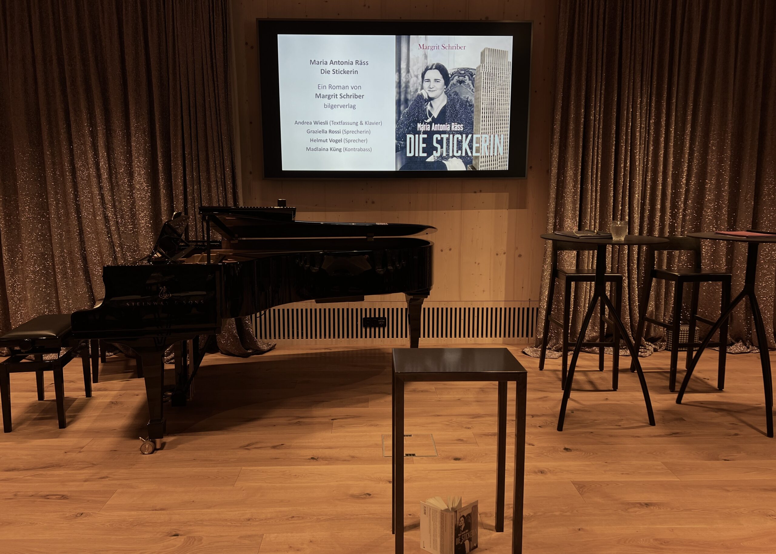 Andrea Wiesli, music curator of the Appenzeller Forum, transformed this novel into a captivating sound chronicle, which premiered in Gonten. The performance featured narrations by Graziella Rossi and Helmut Vogel, accompanied by pianist Andrea Wiesli and double bassist Madlaina Küng. It showcased a diverse selection of music, including the American folk songs Turkey in the Straw and Yankee Doodle, as well as Largo from Sonata Undecimo by Henry Eccles. Puttin’ on the Ritz by Irving Berlin was performed with the actors’ singing, seamlessly blending music and narration. Following the mesmerizing performance, guests enjoyed an Apéro riche, engaged with the author, took photos, had books signed and met the participating artists. This unique format fostered meaningful interactions between audiences and performers, deepening appreciation for the arts.
